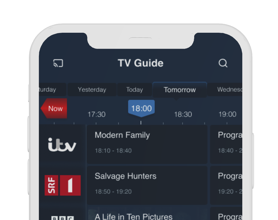 The timeline now includes a "Now" button, allowing users to easily navigate back to the current time and view programs that are currently live. This addition enhances the navigation experience within the Electronic Program Guide (EPG) interface, ensuring that users can quickly access real-time programming with just a single tap.