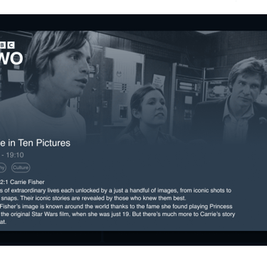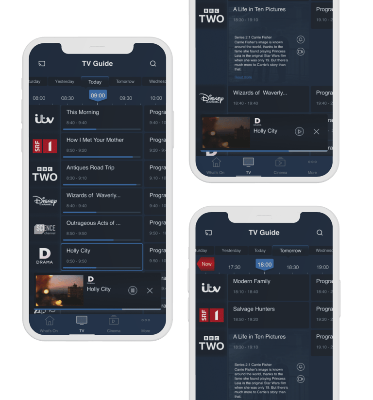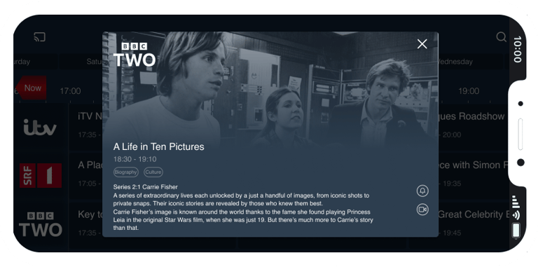 The design for program information has been enhanced to provide users with quick access to essential details and actions. Upon pressing on a program tile, users are presented with minimal information, including a short description and available actions such as play, start over, record, or set a reminder for future programs. Users can then expand the program information to view the full description in a modal window.