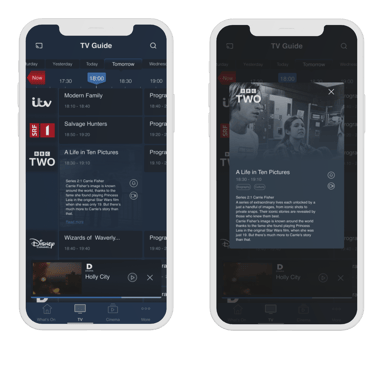 In landscape mode, due to limited screen real estate, the expansion panel has been replaced with a modal preview of program information, ensuring that users can still access detailed program descriptions without compromising the overall user experience.