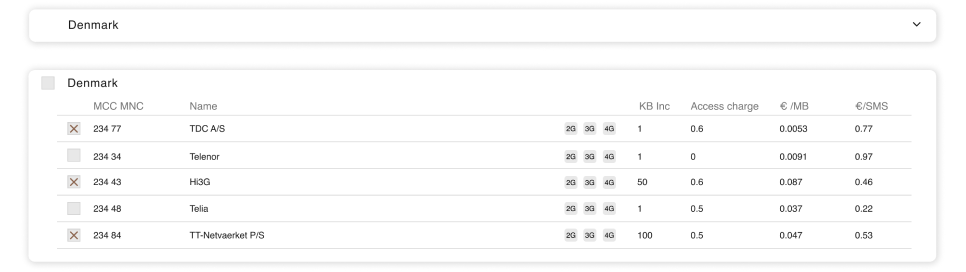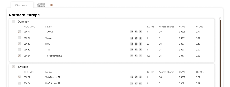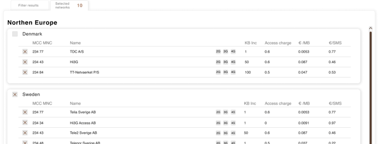That means that it is possible to create network lists that provide maximum coverage for critical devices or keep costs low by removing expensive or unnecessary networks.