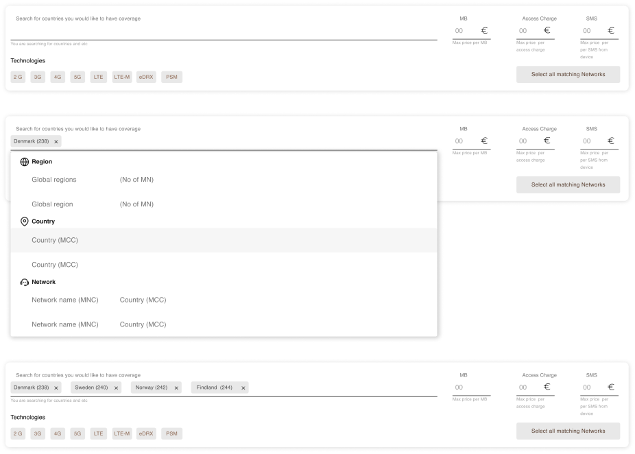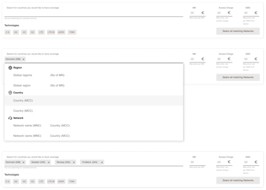 The country, positioned as an expandable panel beneath its respective region, acts as a granular focal point. Upon expansion, users are presented with a detailed breakdown of networks accessible in the selected country. Each network is accompanied by pertinent information, including rates and available technologies, empowering users to make informed selections tailored to their business needs.