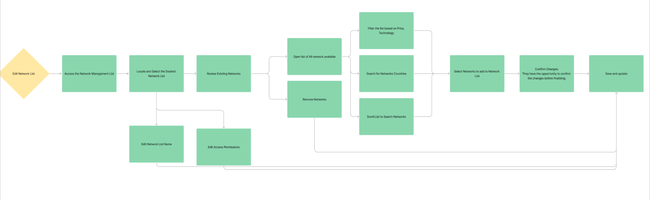 When users enter the editing mode, the UI transitions seamlessly to a distinct interface tailored for modifying existing network lists. This dedicated space allows users to make adjustments, add networks or remove networks. The user can compare network prices and coverage information in this step.