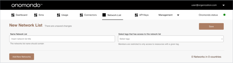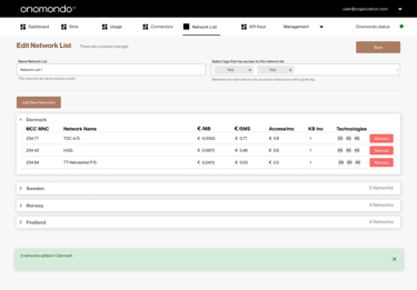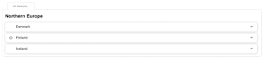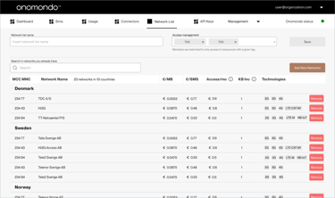 The first tab - labelled "All Networks" displays a list of all networks available for Onomondo customers. If the user have applied filtering, the tab label changes providing user with matching results only .