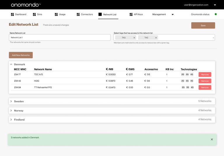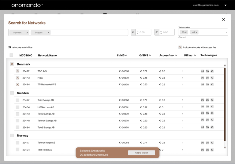 “We (Onomndo customer) are planing to build a Network list for each customer in Onomondo portal for each customer and add these to the SIM when we program the device. We are still figuring out how much data each customer will use, so we could set data limit, and choose networks with me most sensible price.”